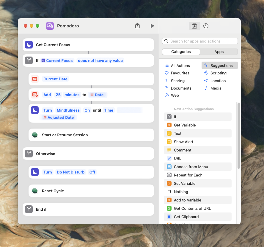 I've created a basic automation of the processes above and called it "Pomodoro". Focus feels effortless. Starting a session sets Do Not Disturb for 25 minutes and start a Flow. Notifications come back during the 5 minute break and I can catch up on the universe. Shortcut