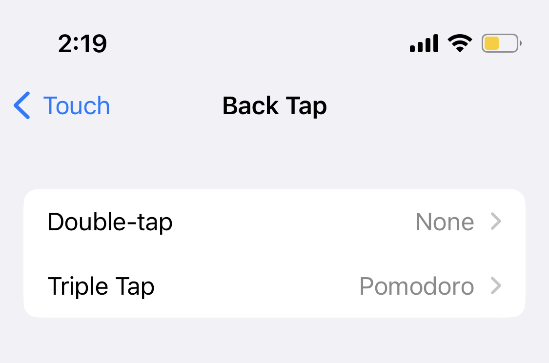 Tripple Tap configured to trigger the Pomodoro shortcut in iPhone.
