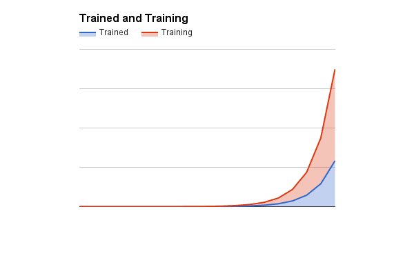 A graph depicting time and number of employees that are Trained vs Training. This is illustrative of what it feels like to go through hypergrowth. Source